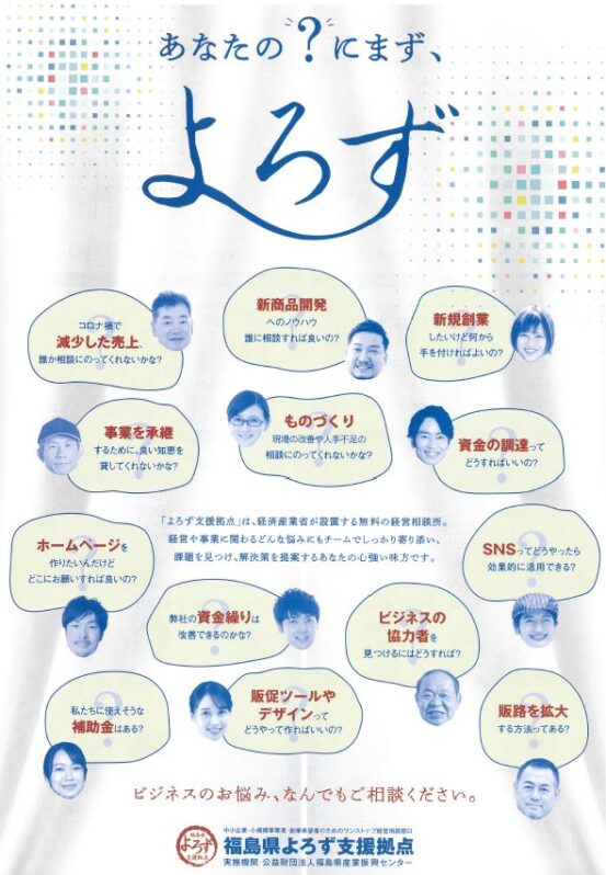 「東北経済産業局中小企業・小規模事業者ワンストップ総合支援事業」として、「福島県よろず支援拠点」を設置しており、「よろず支援拠点」は、中小企業・小規模事業者の困難な経営課題を解決するために、中小企業支援に優れた能力・実績等を有するコーディネーター及びサブコーディネーターが、専門的な助言や専門家の紹介等を行います。
