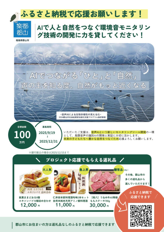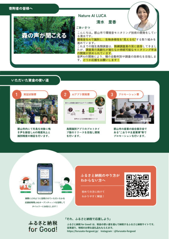「音声AIによる生物多様性の見える化」に取り組むNature AI LUCAの清水 里香 様が、クラウドファンディング型ふるさと納税サイト「ふるさと納税for Good」にプロジェクトを掲載し、寄附を募集いたします。みなさまのご支援をぜひ、よろしくお願いいたします。
