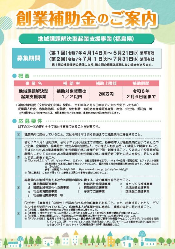 【創業補助金(地域課題解決型企業支援事業(福島県))】のご案内