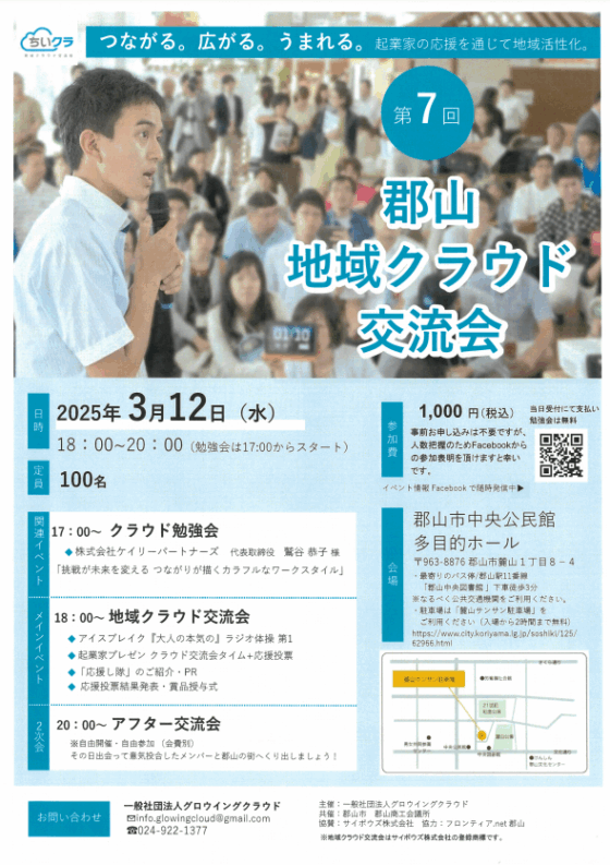 顔の見えるビジネスマッチングの機会と、郡山で起業する起業家の方をクラウドシステムを使い応援する交流会型のイベントです。