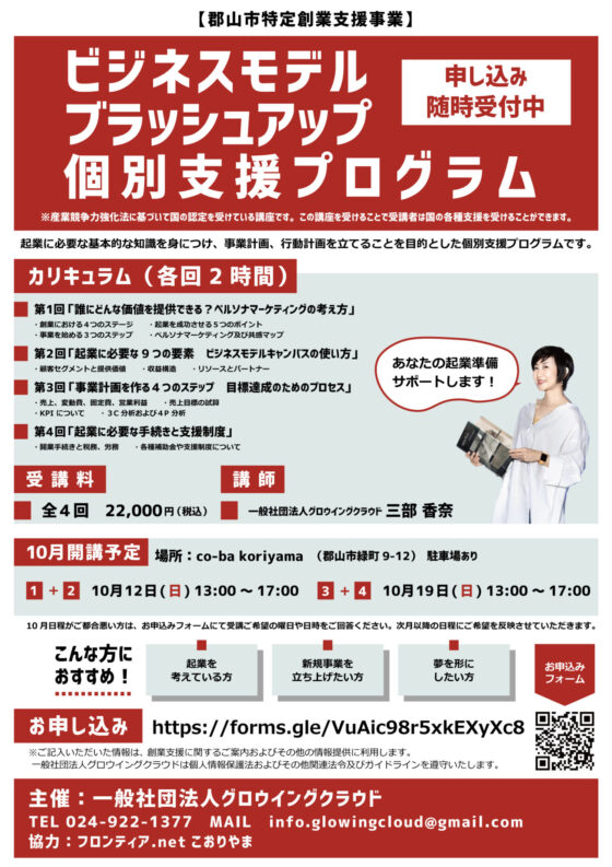 「ビジネスモデルブラッシュアップ個別支援プログラム」(10月開講)のご案内(郡山市特定創業支援事業)